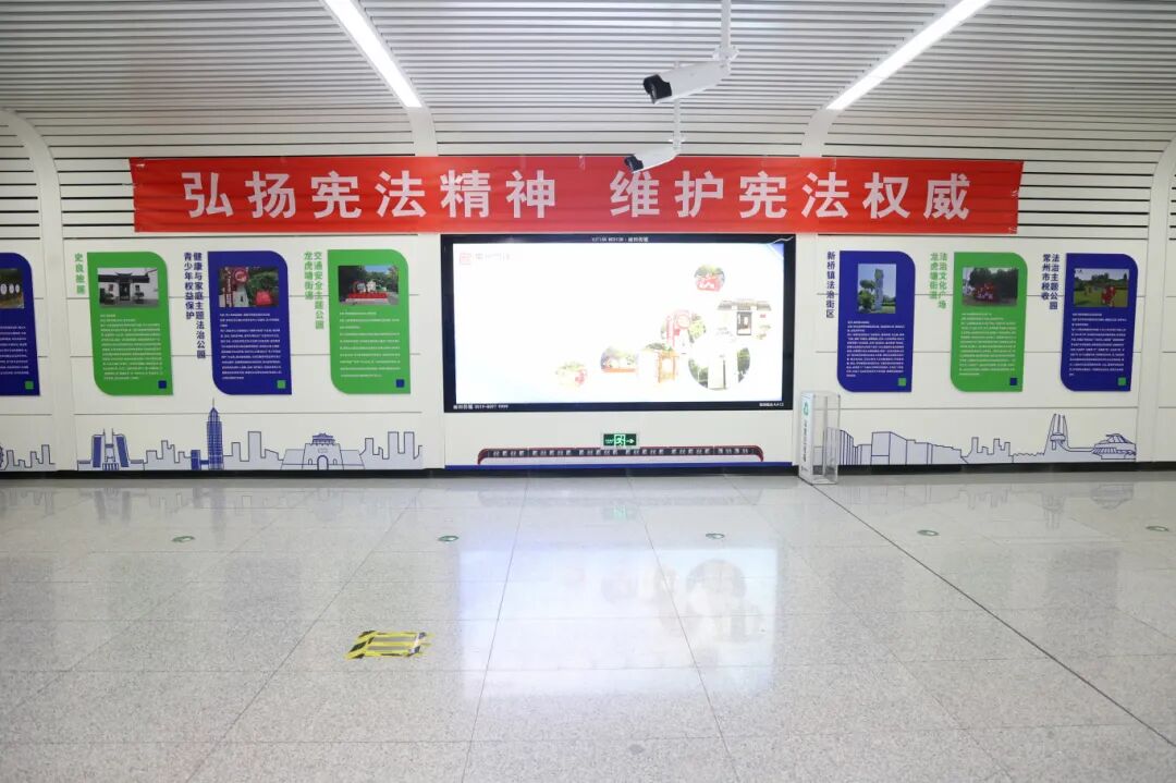 法治文化主题车站以地铁车站为场景,依托站厅层墙面、立柱、通道及灯箱等资源,包含宪法、民法典、地铁沿线法治文化阵地、常州市轨道交通条例等11个版块内容,以一条条权威的宣传口号、一幅幅精美的手绘图案、一个个法治知识点的解读,用生动直观的方式将法治文化和法律知识传播有机结合,让广大市民乘客在轻松的氛围中接受法治文化的熏陶,感受法治精神。